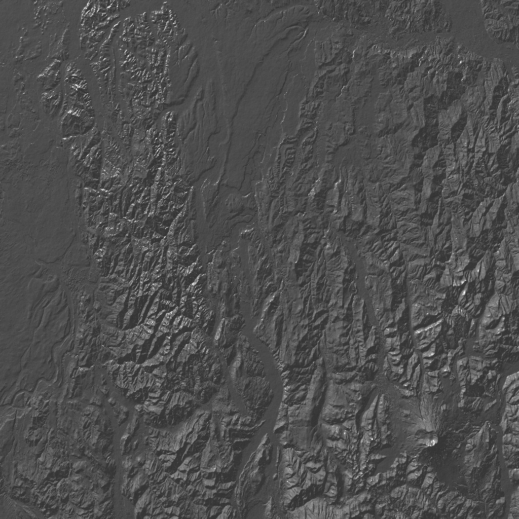 Last winter, I downloaded a square degree of elevation data from the USGS site for the National Elevation Dataset. (This is at arcsecond resolution, so the square is about 3600 by 3600 data points. This represents a rectangle roughly 100 km on a side.) This data was supposed to include Mount St. Helens, but I only rendered one part of it, and the volcano was not in the region I rendered. This evening, I decided to render the entire square degree of data. The volcano appeared in the lower right hand corner in the rendering. (I'm not certain, but I think north is to the left.) This wasn't meant to be a finished rendering; I meant this to be a guide for a more dramatic or artistic view to be put together later. But I was surprised at how handsome this top-down view turned out. One technical nicety: The rendering now has "texture mapping" (an image is used to color the mountains). However, the image used in this rendering to color the mountains is a uniform slate texture, so that aspect of the rendering isn't particularly interesting.