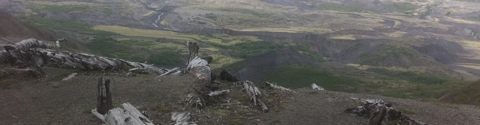 It occurs to me to mention that the banner image on this blog shows logs remaining from the eruption, at the Johnson Observatory [see below]. I took that picture a couple of years ago on a visit to the volcano with some old friends. I remember seeing the zone of destruction, which was more than 200 square miles, a year after the eruption. I went with family members, including my grandfather. This was astounding: we drove through a forest, and suddenly, we were in the zone of destruction, which had a sharp edge marking where the pyroclastic flow from the mountain had gone. The zone was vast (roughly 15 miles across). It's now beginning to recover and turn green.